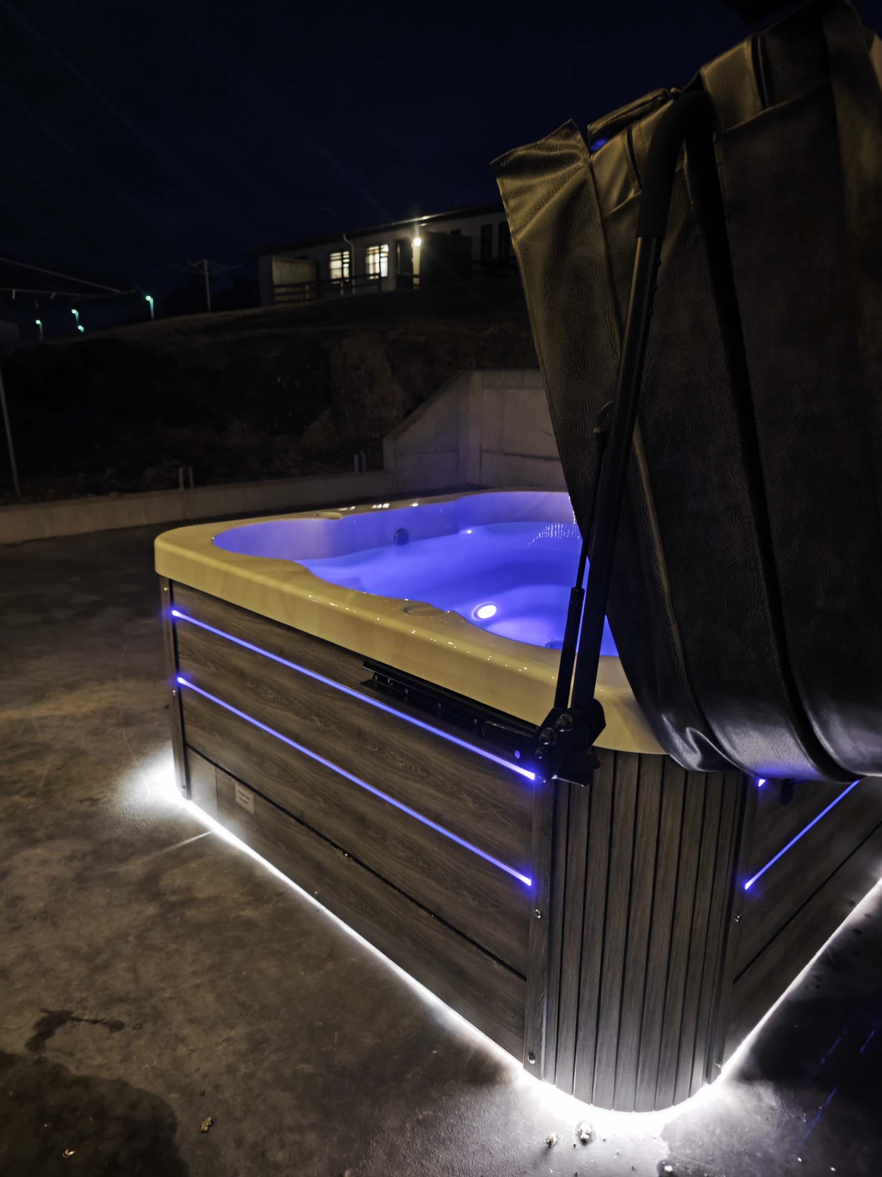 LED lýsing er bæði í skel og klæðningu, stýrð með rofa. Pottinum fylgir létt, einangrað 15 cm lok og tröppur í stíl við valda klæðningu.